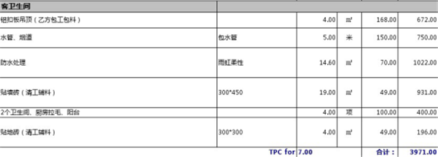 西安130平裝修之主衛生間,要求和廚房差不多,唯一不同就是衛生間兩根大管道需要紅磚包(此處也要小心了,有的裝修公司只算一根管道,施工的時候再加,業主只注意有包管道這一項,可是忽視了有幾根),防水也要做,不過此衛生間三面墻朝自己家,所以防水必須全做(這點業主注意了,好的裝修公司會替業主著想,有的裝修公司就不會說這個,你家防水就做少了,總價下來了,這就是隱形偷項,裝完了你住進去墻面就開始發霉了,所以業主謹記),看一下詳細預算