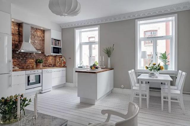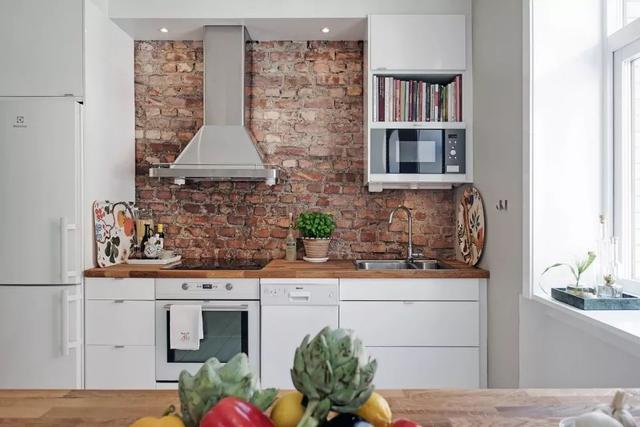 廚房,乍一看這紅裸墻,感覺有點破舊,但太單一的墻面會有審美疲勞,加點裸墻的感覺就不一樣了,而且廚房這里也不適合白墻。