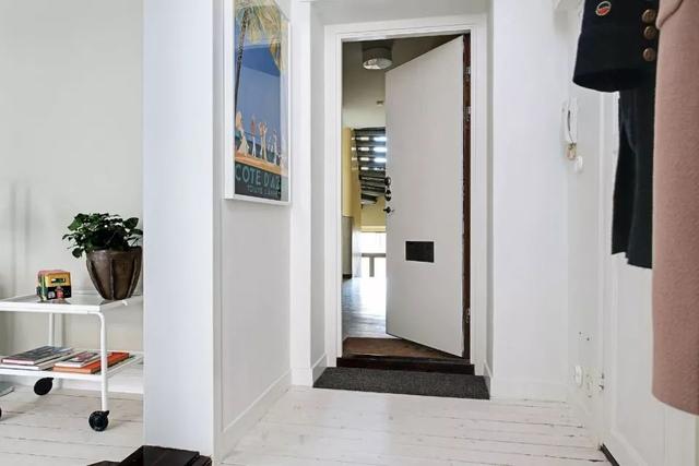 玄關(guān)比較窄,不適合打那種衣服鞋柜一體式的組合柜,所以就給裝了這么一個衣帽架,鞋子直接擺放在角落里,對面的墻角內(nèi)還特意掛了個角柜,擺放飾品或放鑰匙。