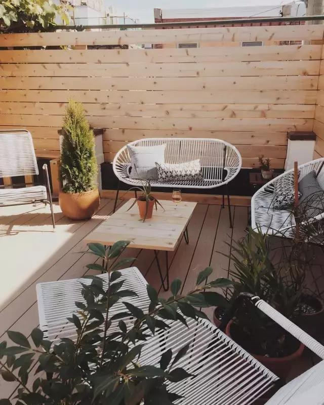 防腐木護欄+攀緣類綠色植物,不僅可以通過圍合式手法制造出私密空間,而且也將整個露臺設計變成了室內空間的戶外延伸,看上去毫無違和感。