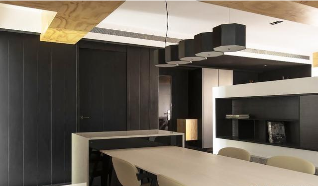 黑與白的呼應(yīng),不僅錯(cuò)落在墻柜和桌椅的內(nèi)外之間,也毫不手軟的從墻刷往門(mén)和天花,讓對(duì)比色變得更有立體感,可說(shuō)既巧妙隱藏了廚房、寢臥和衛(wèi)浴,也可從不同視角對(duì)比框住各形各式的幾何線條之美。