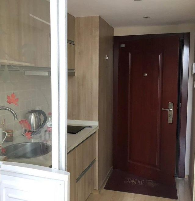進門首先是單身公寓的常規(guī)操作,左手廚房,右手衛(wèi)生間,為了隔開油煙,客廳和玄關(guān)用玻璃推拉門隔開。