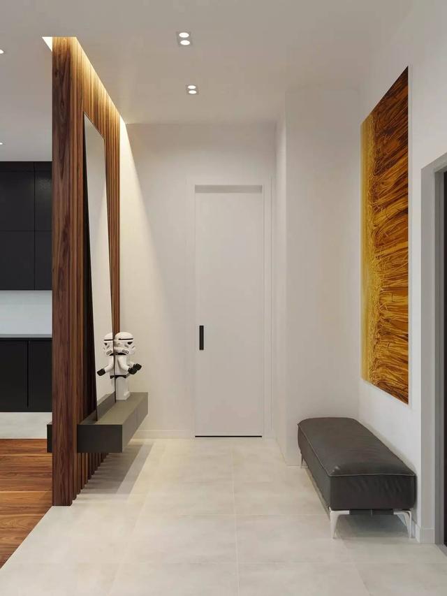 玄關,正對一道隱藏門。入戶風景沒有很復雜,先來個科幻元素點綴一下懸空的端景矮柜。
