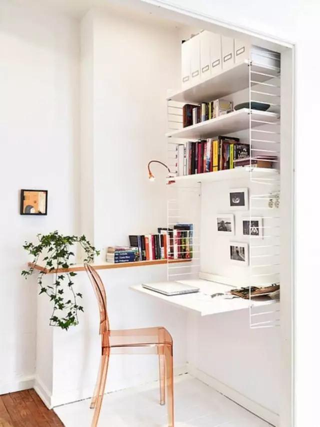 利用轉角安裝L字型書桌,再在墻面上安裝上書架,擺放書籍,一個簡單而別致的轉角書房則打造完畢,頓時為居室增添一個實用的功能區。