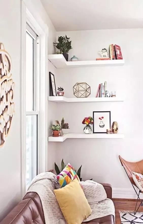 如果覺得轉角的墻面太過單調,則可以安裝上隔板,再擺放上擺件綠植等裝飾空間,頓時可以讓此處的格調提升,同時還能多出一部分的收納空間。