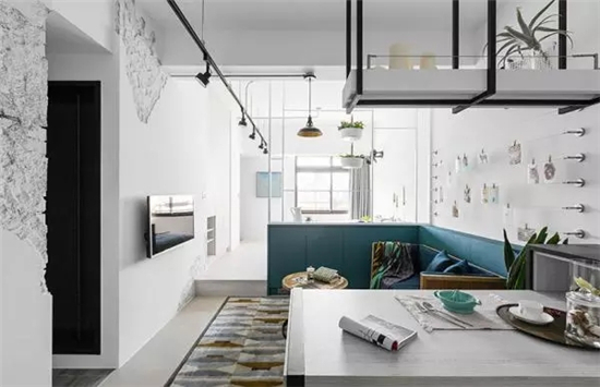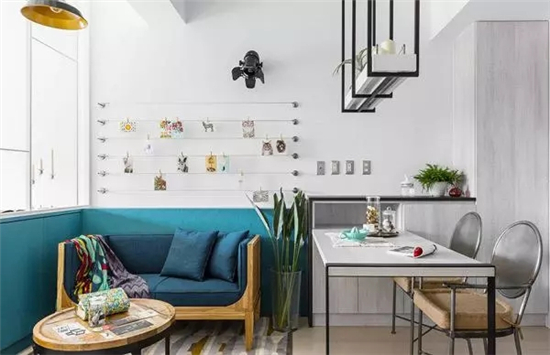 將這個小空間改造成了開放式設計,為了明確區分不同功能區間,設計師在顏色的選擇上下足了功能,把白色的的空間作為重點區域,亮眼的藍綠色的柜體和沙發讓客廳生動起來。
