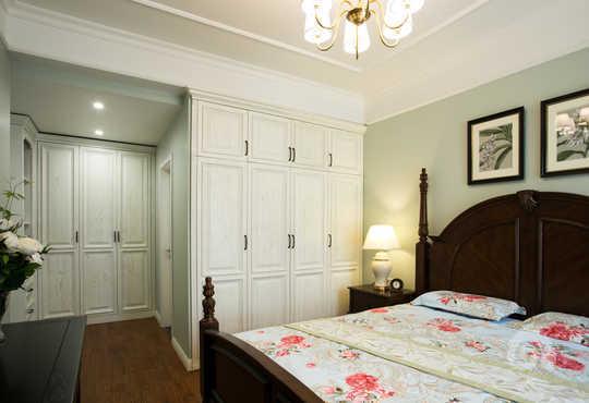 主臥的整體造型設計都非常的簡潔,美式實木床和深色的地板相結合,給人非常溫馨的感覺。深色與淺色的對比,彰顯出現代美式的一種層次感,簡潔明晰。