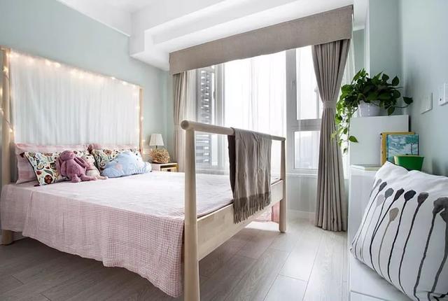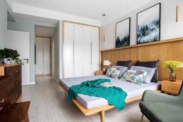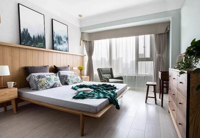 主臥室定制的實木板床頭,特別有層次感,這里的飄窗拆掉后,作為一個休息區,顯得臥室更大氣了一些。