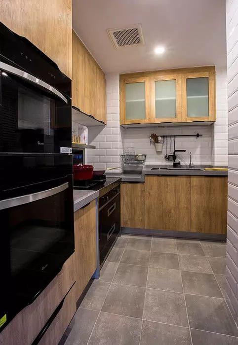 廚房櫥柜根據結構做了L型,現在都是定制的櫥柜,所以柜門臺面的顏色和款式都可以根據喜好決定,整體風格比較偏原木,所以就選擇了這種顏色的柜門,也挺好看的。
