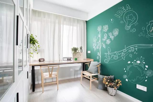 獨立的小書房主要是給孩子學習和業主辦公用的,右邊做了一個綠色黑板漆涂刷的黑板墻,可以用來diy,左邊是一組定制的書柜。
