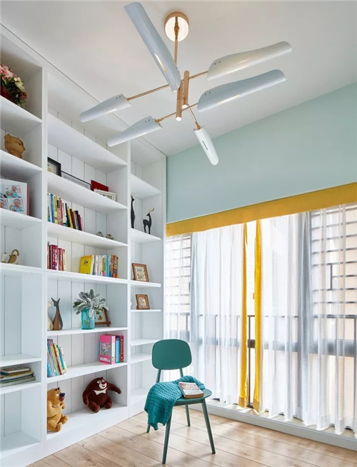 書房是文藝清淺一隅。舒適溫潤的原木地板、形態優雅的吊扇燈、如同圖書館般的開放式書柜;一張靠背椅,一席能透光的窗紗,讀一本書,仿佛就能跨越半個世紀去思考、去暢想......