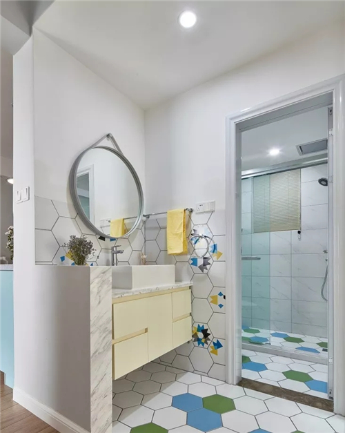 ??衛生間裝修采用水槽的外部設計方法,不僅巧妙地劃分功能區,還為過道空間帶來充足的光線。六角形的小色磚和木地板明顯劃分了兩個浴室和過道空間,使日常護理更容易。