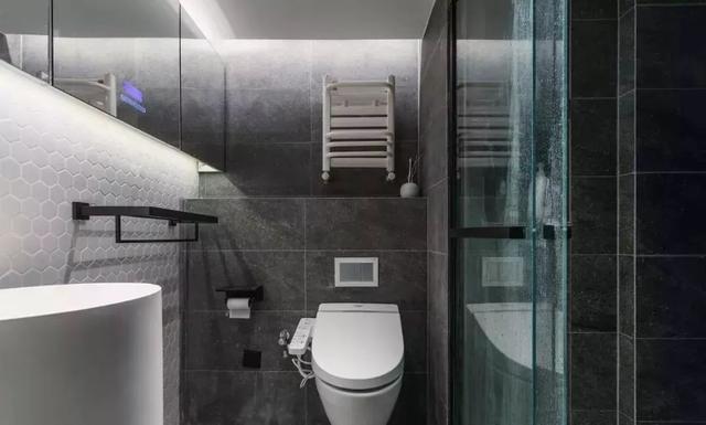 衛生間用玻璃推拉門做了隔斷,采用了干濕分離的設計,墻壁大面積黑磚的設計現代感十足。