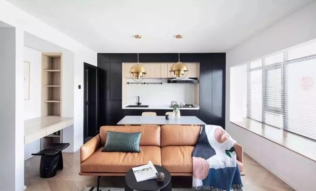 黑色的櫥柜既像廚房既能儲物又像是沙發的背景墻