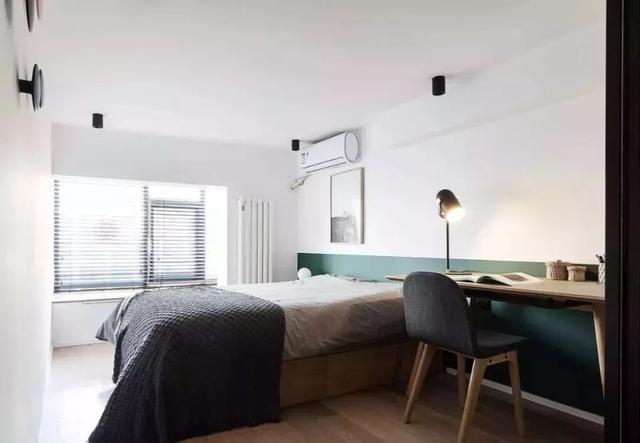 主臥中整面墨綠的背景墻配上兩盞金屬小燈