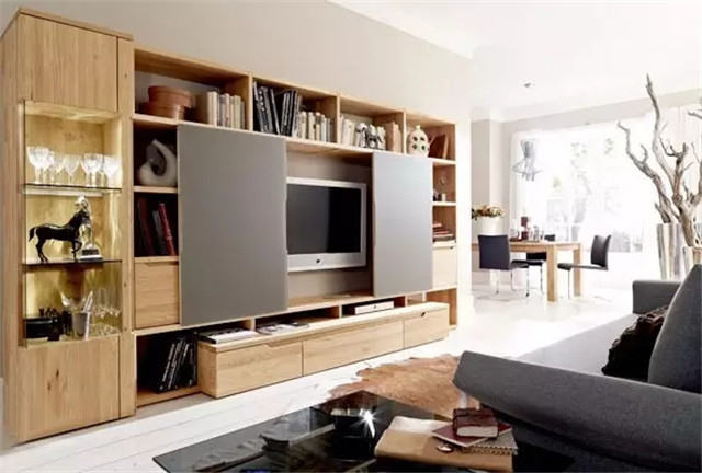 在客廳安裝組合式電視柜,不僅能陳列一些裝飾擺件,還具有一定的收納功能,更能增加客廳的層次感。