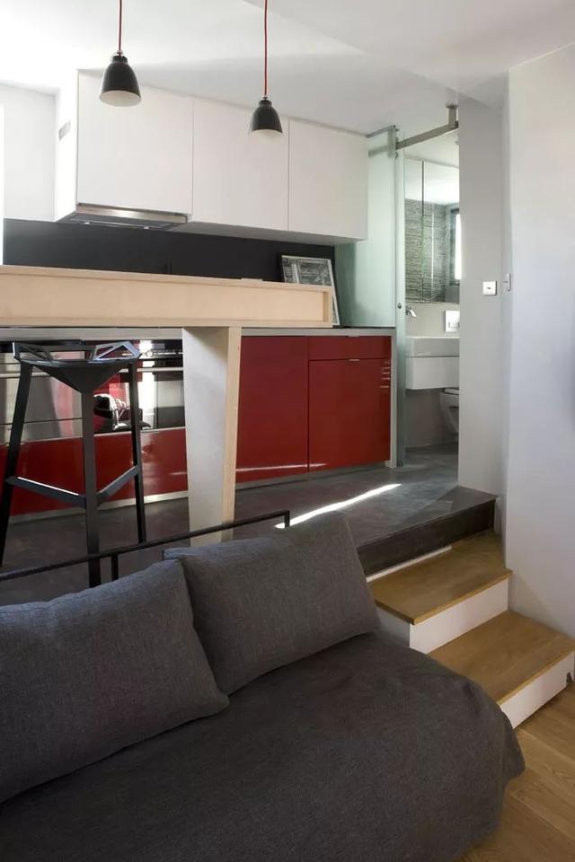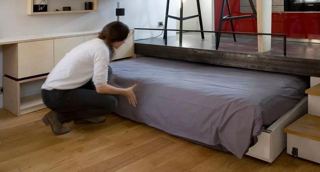 將隱藏在抬高區域下面的床拉出來,臥室就出來了,這腦洞厲害了~