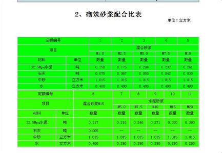 每立方M7.5 混合砂漿P.S32.5 水泥用量0.277T 細(xì)砂1.23m3 石灰膏76kg 水0.34m3 每立方M5.0 混合砂漿P.S32.5水泥用量0.245T細(xì)砂1.23m3石灰膏107kg水0.32m32、