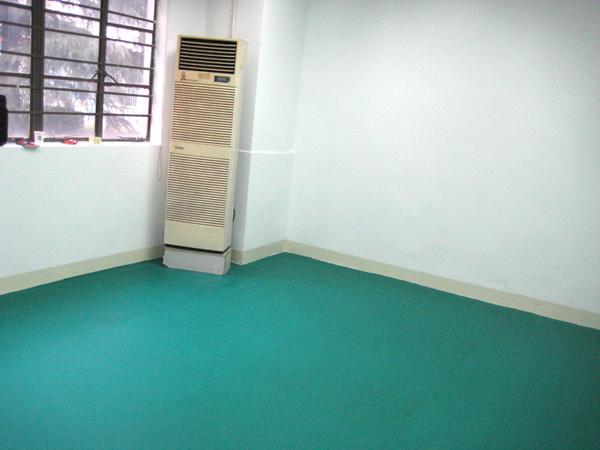 ③接地導電網鋪設后,清潔干燥地面,涂導電膠液,晾干20-30分鐘,以手不粘為止,防靜電地墊底面(黑色面)操作相同(涂導電膠一次即可),然后把防靜電膠板和地面粘合,再用重輥滾壓5次,使之防靜電膠板表面整齊平直即可,在常溫下48小時以后便可使用。
