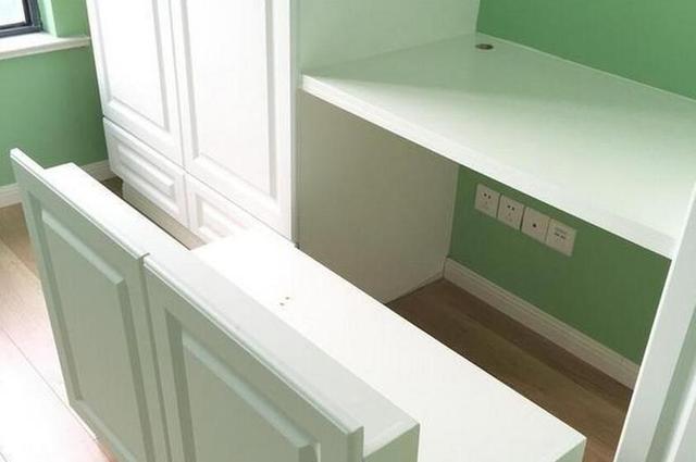衣柜的中間采用了內(nèi)嵌式的設(shè)計,里面可以擺放電視機,下方的柜子還可以拉出來充當(dāng)書桌使用,非常方便。