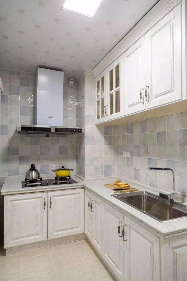 廚房,廚房是L型的布局,白色的櫥柜白色的臺面,還做了白色的額吊柜,墻面上是灰色的瓷磚,整個廚房看起來都很干凈簡約。而且廚房的面積并不大,淺色正適合小廚房,這樣不會顯得廚房里擁擠雜亂。