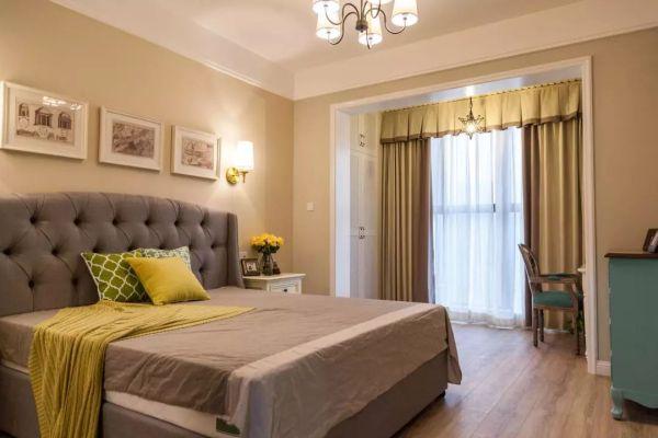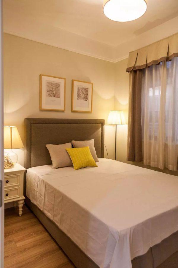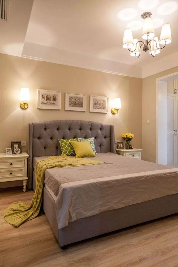 主臥里墻面是暖暖的色調,燈光也是暖黃色的,搭配灰色的床鋪,看起來很有質感,強奸掛的裝飾畫帶有懷舊情調,整個臥室都低調而溫馨。