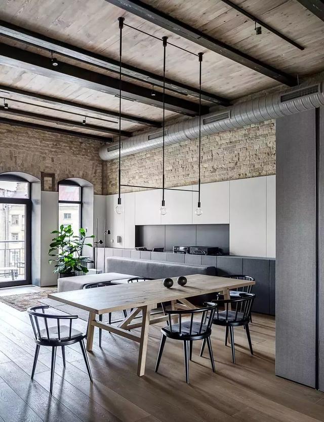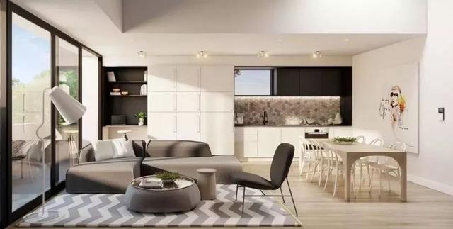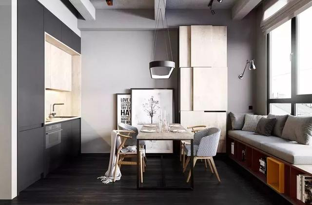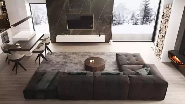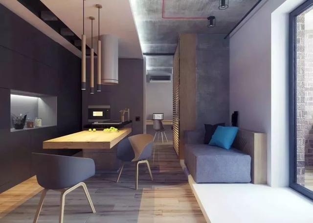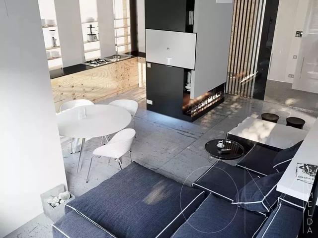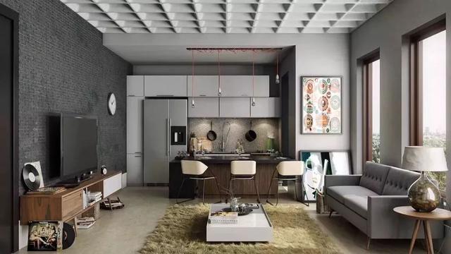 適合男性單身貴族的家,紋理墻壁,天花板,甚至腳下的豪華地毯都參與了廚房、餐廳和客廳的隔斷。