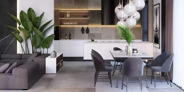 說到大小,這個廚房、餐廳、客廳組合,使用了高大的植物和裝飾性的球形燈吸引眼球,并營造出更多空間的錯覺。地板和墻壁采用石材加工,可營造出現代風格。