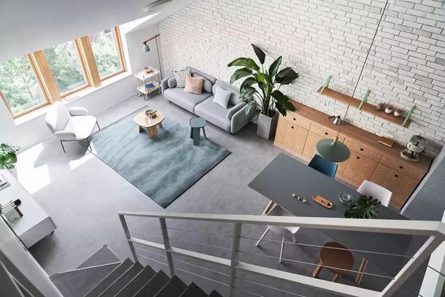 溫暖的木色,白色和青色的小圓點讓空間看起來更加柔和,而地毯、沙發餐桌則提高了室內的高級感。