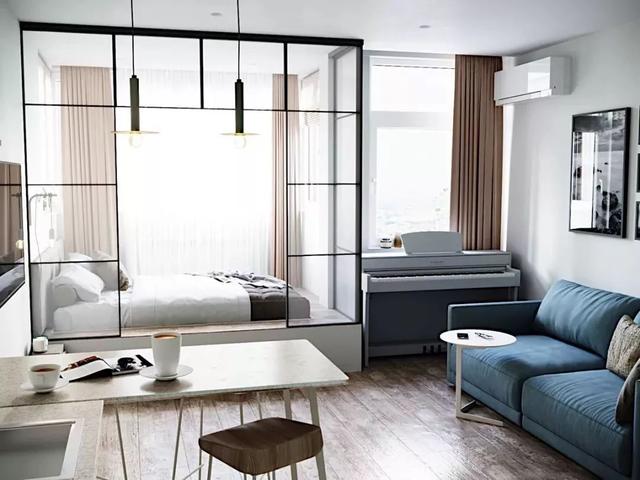 現代風格的一居室,幾乎沒有隔離空間,可以使用玻璃隔斷或紡織品來充當區分空間的辦法。