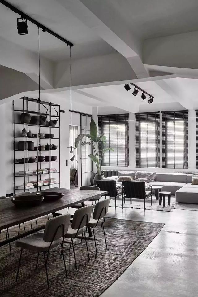 一些朋友害怕使用深顏色單色家具,但是黑色用的好,也不會讓空間感到局促。上圖的設計為時尚現代的用餐客廳組合提供了一種陰陽裝飾,白色沙發、淺色天然木材和黑色餐桌。