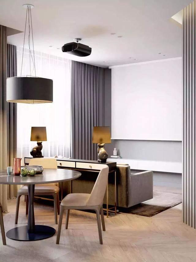 在這個家的簡約設計中,有兔子燈的玄關桌提供了一個臨時的軟隔斷,將餐廳與客廳隔開,同時仍然留有娛樂空間。大型投影儀屏幕不管在哪個位置看起來都清晰方便。
