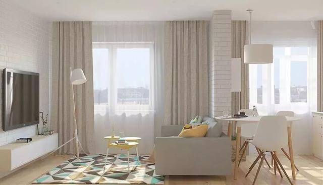 幾何圖形地毯和枕頭為整個小空間中使用的中性色調增添了一抹色彩。而墻壁,家具,甚至燈具共享色調,也為整個家增加了輕盈感。