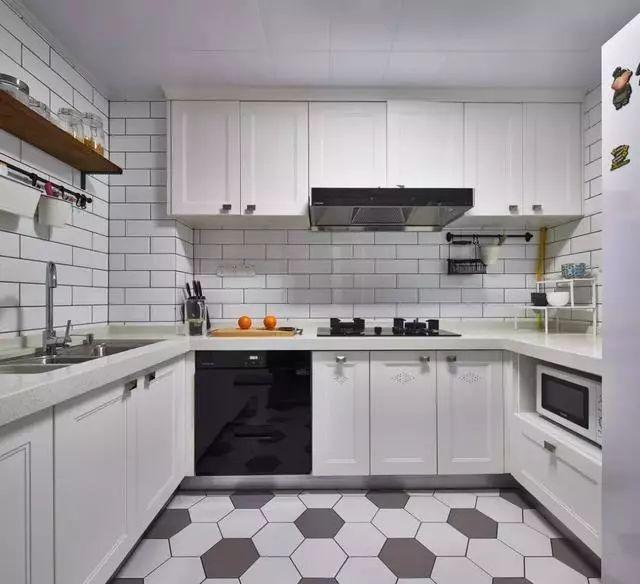 白色的小方塊墻磚與乳白色櫥柜,還有六邊形的地磚,讓整個廚房更加干凈、明亮。