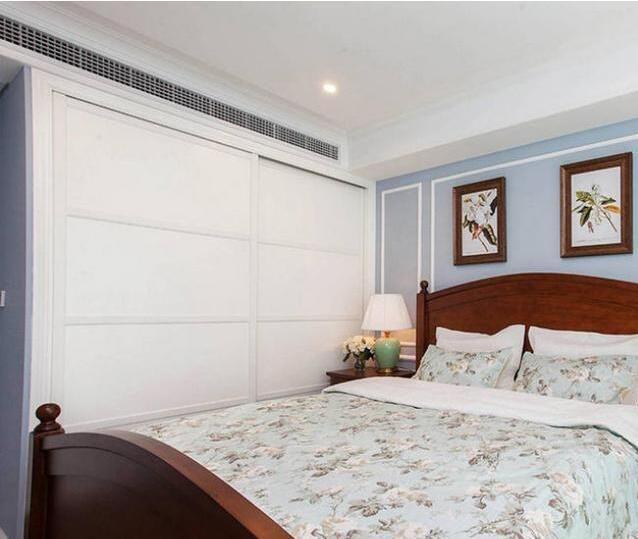 主臥室,頂部吊頂裝成空調(diào)管道,做到頂?shù)陌咨p推拉門大衣柜,省地方,衣物收納足夠了。
