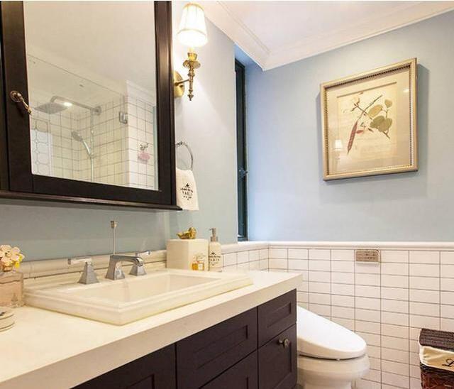 衛(wèi)生間,格局設(shè)計(jì)的不錯(cuò),洗手臺(tái)采用了黑白搭配的風(fēng)格,上方安裝鏡面柜,收納很豐富,墻面藍(lán)色墻漆與白色瓷磚的搭配,顯得干凈自然。