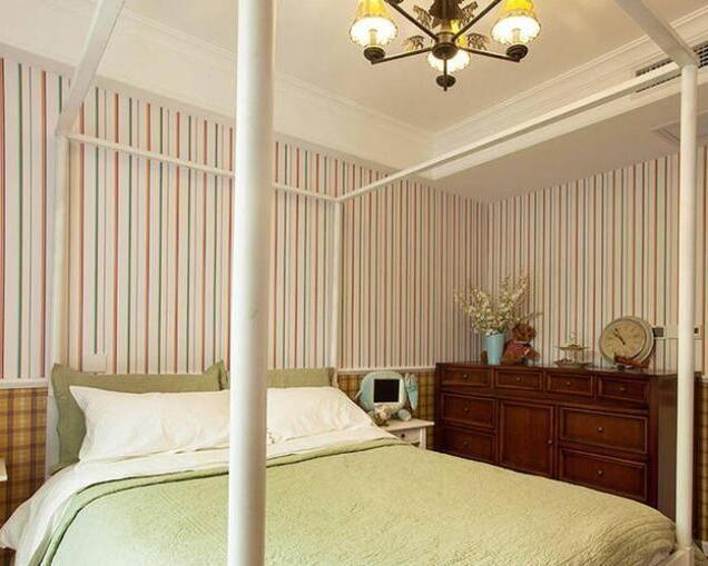 次臥父母房,色彩就沒那么豐富,主要以穩(wěn)重為主,墻面貼的豎線條紋墻紙顯得層高。