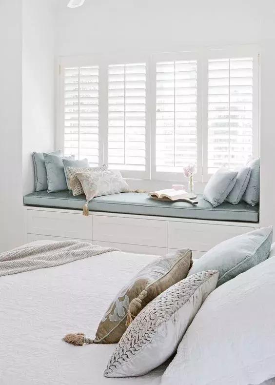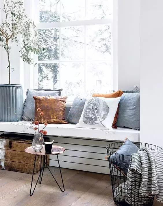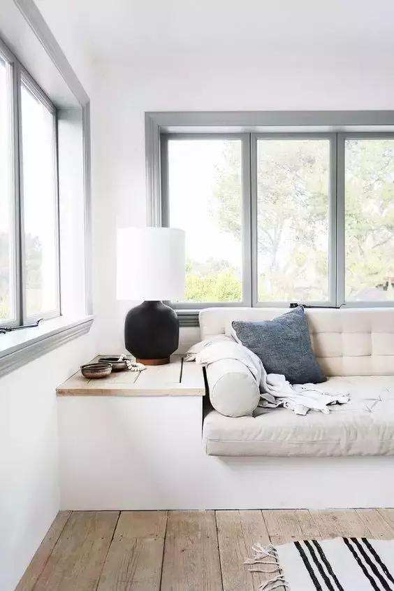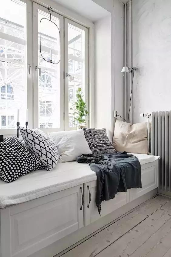 無論飄窗是哪種形式的,地臺上都會鋪上一層坐墊。特別是時下流行的石材臺面,冬天坐上去的時候,簡直是酷刑,這個時候坐墊不僅溫暖柔暖,還能搭配室內軟裝的裝飾,何樂而不為呢?