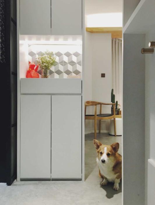 鞋柜設置在正對門的位置,與廚房的墻隔開了一點距離,讓廚房的推拉門可以隱藏起來。柜子中間空出的部分是貼的花磚,很有立體感。在進門右側還做了一塊15公分深的小隔板,上面放些小擺件,下面的銅掛鉤可用掛雨傘還有狗狗的牽引繩。