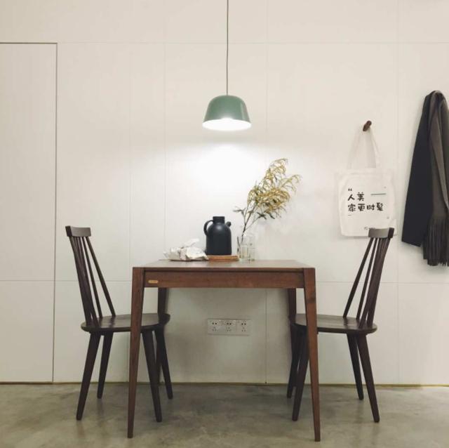 餐桌買的是可伸縮款式,平時兩個人在家不展開就足夠使用。來客人的話可以展開到1.3m,坐6個人沒問題,8個人擠擠也能滿足。靠著的墻做了一整面的護墻板,主要是為了把衛生間門給藏起來,為了藏得更隱秘還在墻上拉了凹槽與隱門的門縫形成一體,現在已經好幾個人在我家喝醉之后找不著廁所了,哈哈哈。