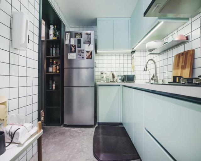 原本冰箱旁邊的墻有40幾公分,無法蓋住冰箱側面,所以做了一個隔板柜把深度補了出來,又能放酒又能擋冰箱,一舉多得的好設計。老房子沒有通天然氣,冰箱旁邊的櫥柜下柜是放煤氣罐的。提醒各位朋友一定要記得裝柜底燈,實在是太好用了!