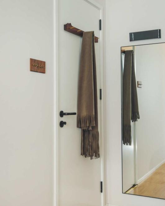 主臥入門和正對面是衣柜的側面,我們也做了一個柜子,原理跟電視背景墻與鞋柜的關系是一樣的,在利用空間的同時,也讓柜子側面顯得不那么生硬。全身鏡藏在門的背后,盡量把原本利用不到的空間都利用起來。