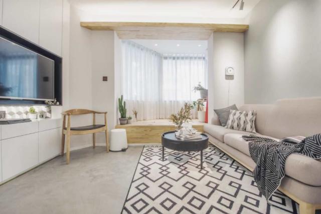 客廳墻體貼了米白偏灰的壁紙,沙發背景貼了灰綠的壁紙,兩種顏色搭配起來,讓家給人一種心曠神怡的感覺。地臺的位置原本是客廳的陽臺,我們想著主臥還有一個生活陽臺,所以就把客廳陽臺納入客廳空間。做成飄窗兼顧收納儲物的同時,以后也可以作為寶寶玩耍的區域。