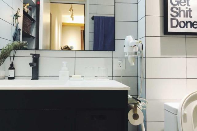 浴室柜是現場制作的,旁邊留出一定的距離放些小雜物。臺盆用了下凹的造型,更好打理做衛生。旁邊的壁龕是原本就有的,裝修師傅算好尺寸讓磚貼得不多不少,放些洗漱保養用品還是很方便的。