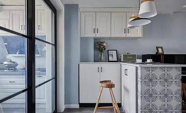 餐廳里安裝了一個小吧臺作為隔斷使用,吧臺的下方還具有收納空間,上方的墻面上還設置了吊柜,增加了這里的收納功能。