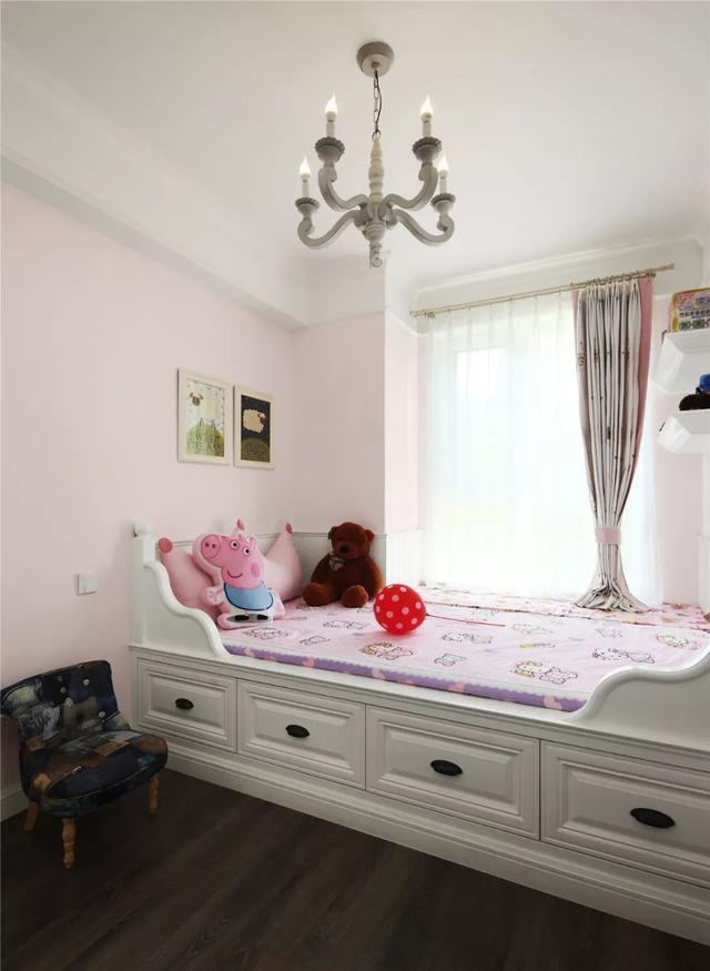 兒童房,格調(diào)最為清新活潑,采用榻榻米設(shè)計(jì),臥床下面還有收納抽屜,好實(shí)用。背景墻刷上了粉粉的色調(diào),滿(mǎn)滿(mǎn)少女心。