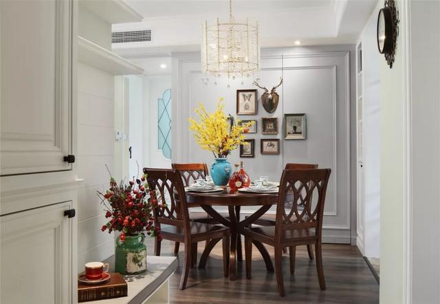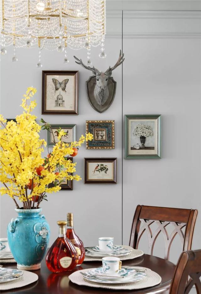 背景墻上還用了好看的壁畫(huà)來(lái)裝飾,湖藍(lán)色的小花瓶也尤為奪目,水晶吊燈超級(jí)漂亮,好喜歡這種優(yōu)雅精致的搭配!