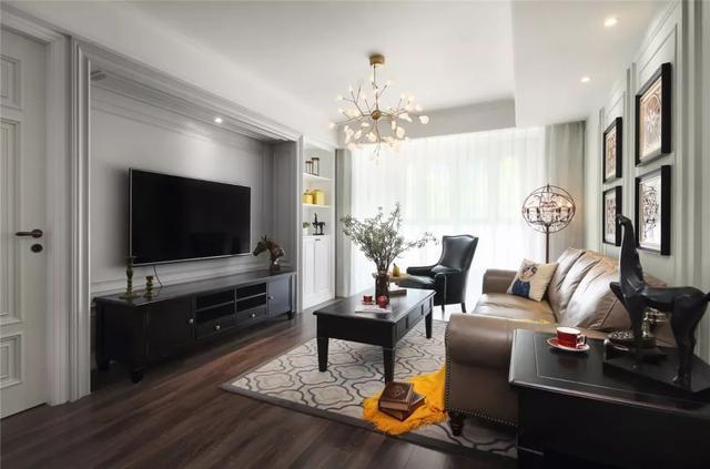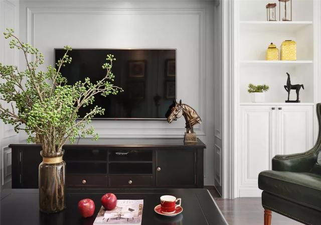 硬裝軟裝,顏色對(duì)比鮮明。電視機(jī)區(qū)域采用內(nèi)嵌式設(shè)計(jì),真的特別棒!擺放精致的裝飾品做點(diǎn)綴,會(huì)讓空間看起來(lái)十分有品位。