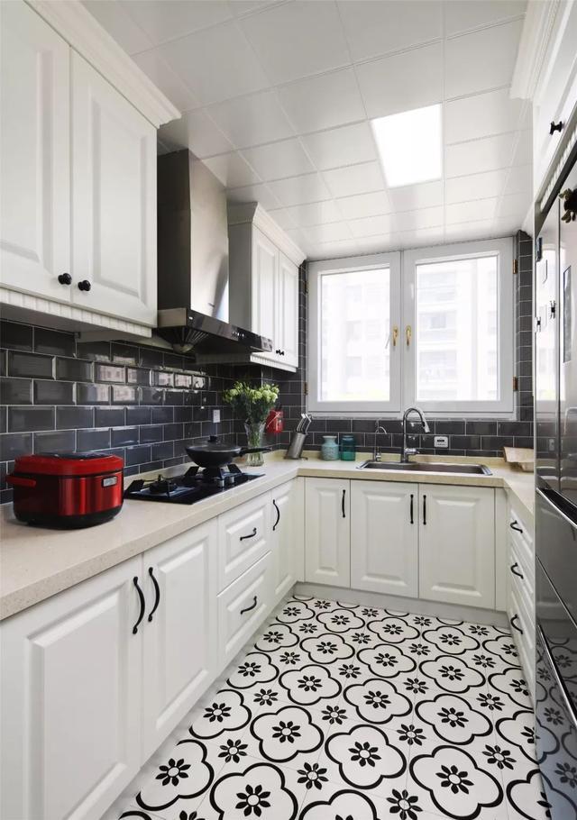 U型廚房,米色櫥柜和臺(tái)面清爽大方,灰色的小墻磚極具時(shí)尚感,地面的花磚讓空間看起來(lái)更有立體感。