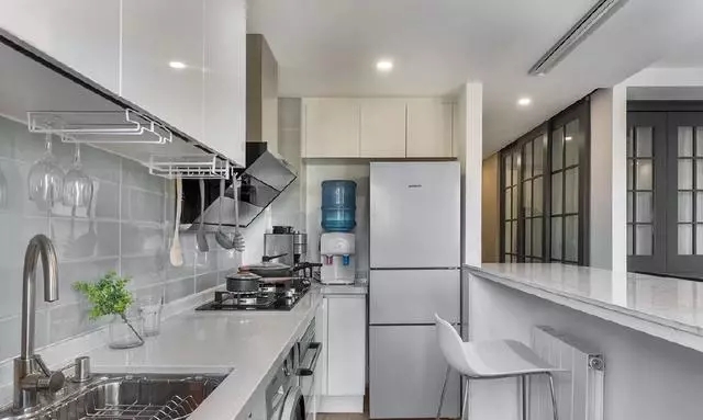 因為面積比較小,所以廚房和客廳是連著的,在視覺上面整個空間似乎更大一些,開放式對于小戶型的房子也是不錯的選擇。